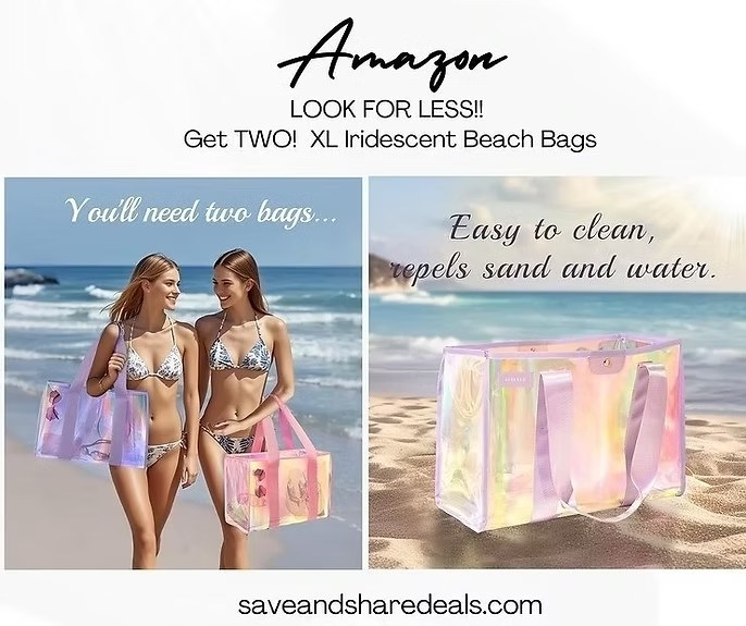 These bags are giving the popular Casemate Bag vibes but for way, way less AND you get TWO of them AND a waterproof phone bag! clear, cute, and ready to haul all the snacks and goggles to the pool and beach! These two XL Iridescent Beach Bag Set is dropping with XRHNPEEL at check out! ad
